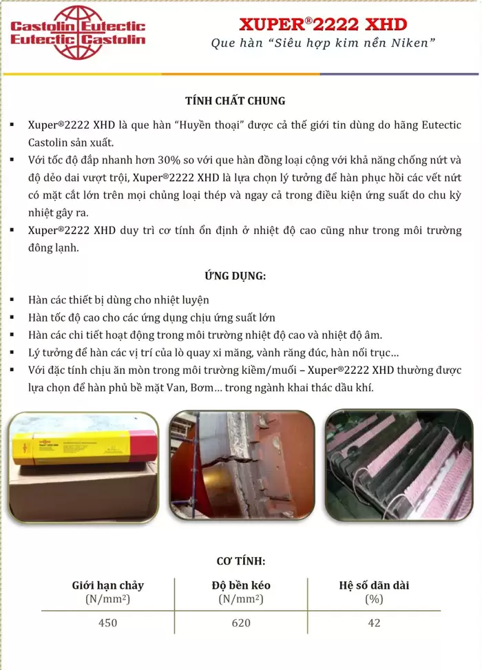 - Que hàn Xuper 2222 XHD Castolin Eutectic là giải pháp tối ưu cho các ứng dụng hàn phục hồi, đắp dày và chịu nhiệt cao.