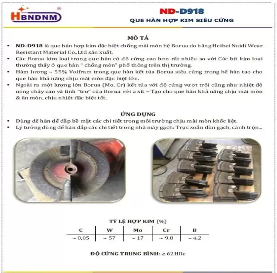 - ND-D918 là que hàn hợp kim đặc biệt chống mài mòn hệ Borua do hãng Heibei Naidi Wear Resistant Material Co.,Ltd sản xuất.