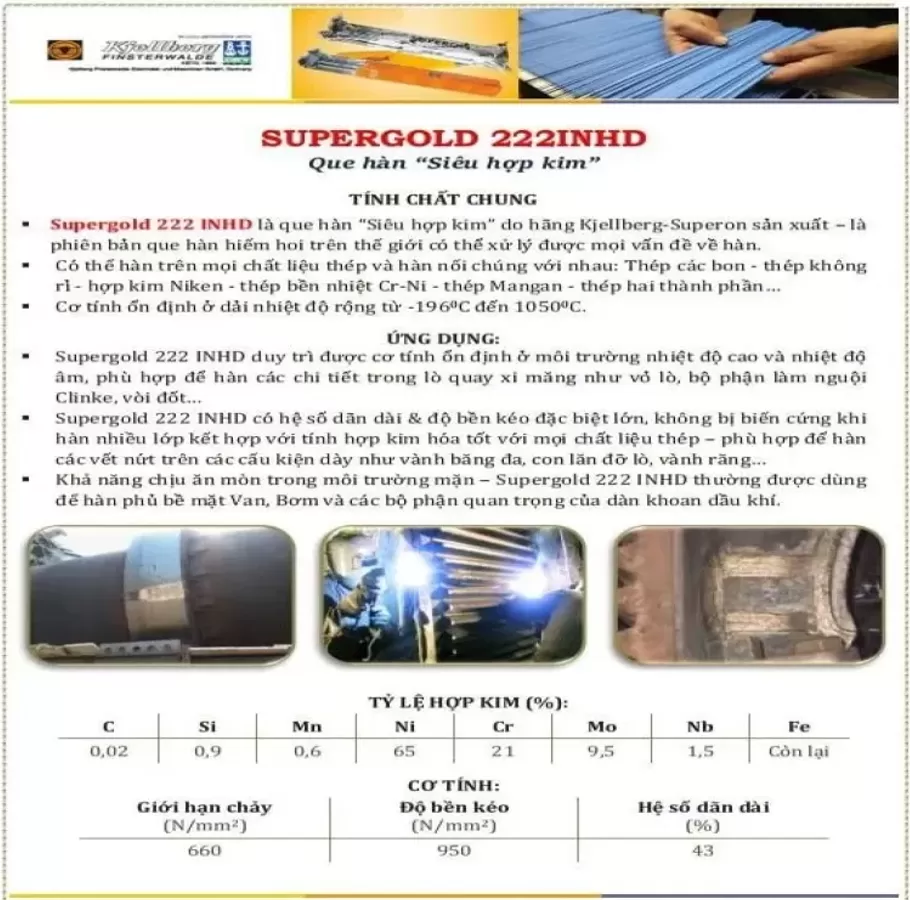 - Supergold 222 INHD là que hàn “Siêu hợp kim” - phiên bản que hàn hiếm hoi trên thế giới có thể xử lý được mọi vấn đề về hàn.